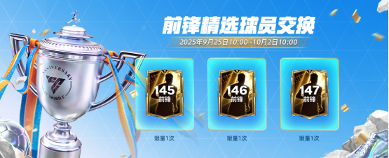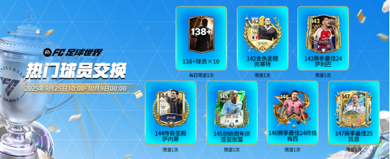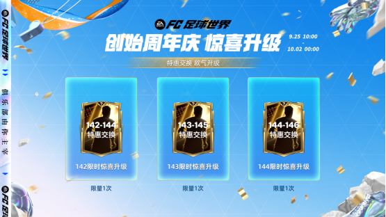 9月25日10:00-10月1日24:00,限时惊喜升级交换开启,特惠参与142、143、144创始周年庆限时惊喜升级交换,有几率获得更高能力值球员卡奖励,每项卡池玩家仅限参与一次。