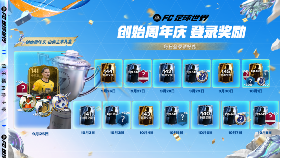 9月25日-10月8日,玩家在以上14天内登录《FC足球世界》,即可前往创始周年庆·由你主宰活动-欢度假日章节中领取登录奖励!