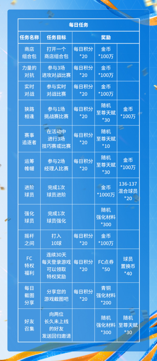 在全新的任务中,玩家将可以获得至尊天赋、强化材料、金币,以及136-137混合球员卡在内的丰富奖励。获取每日积分,领取每日奖励及每周奖励。