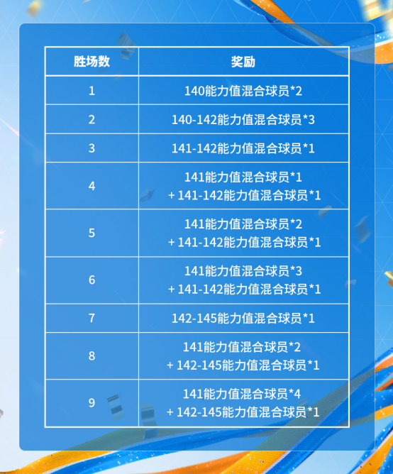冠军决赛活动的冠军赛阶段奖励下周开始也将迎来更新。最高9场胜利后,可以获得142-145能力值混合球员*1、141能力值混合球员*4球员卡奖励。