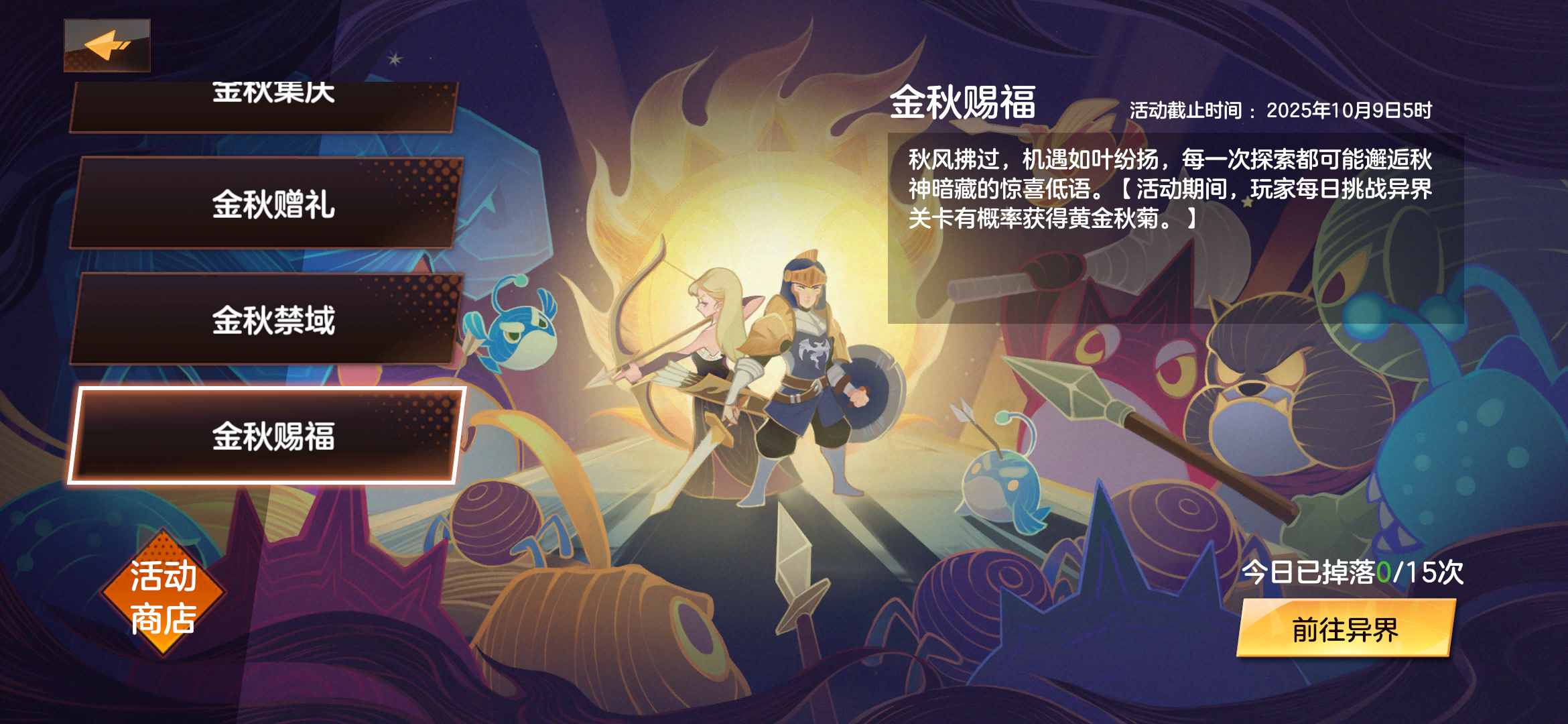 活动期间,冒险者每日挑战异界关卡有概率获得黄金秋菊,可用于在活动商店兑换各式好礼。