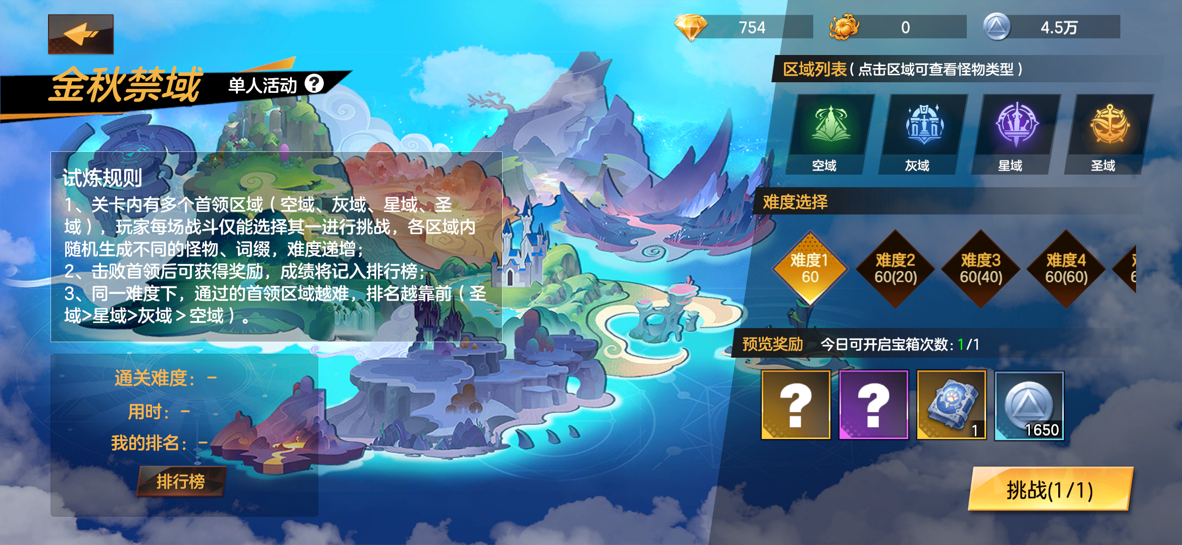 关卡内有多个首领区域(空域、灰域、星域、圣域),冒险者每场战斗仅能选择其一进行挑战,各区域内随机生成不同的怪物、词缀,难度递增;