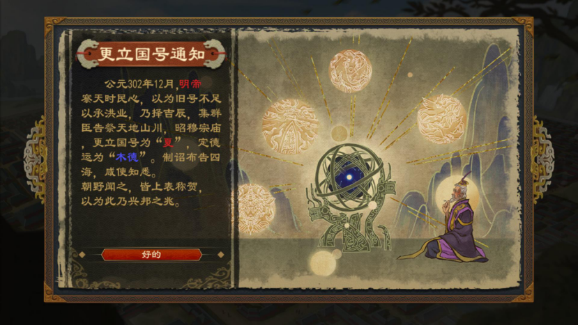 在河内地区存在都城或陪都时,将生成“建号有商”战略,若我方为王朝天子、量级达到战国,且统一了河东、河西、河洛地区,则满足更改条件。
