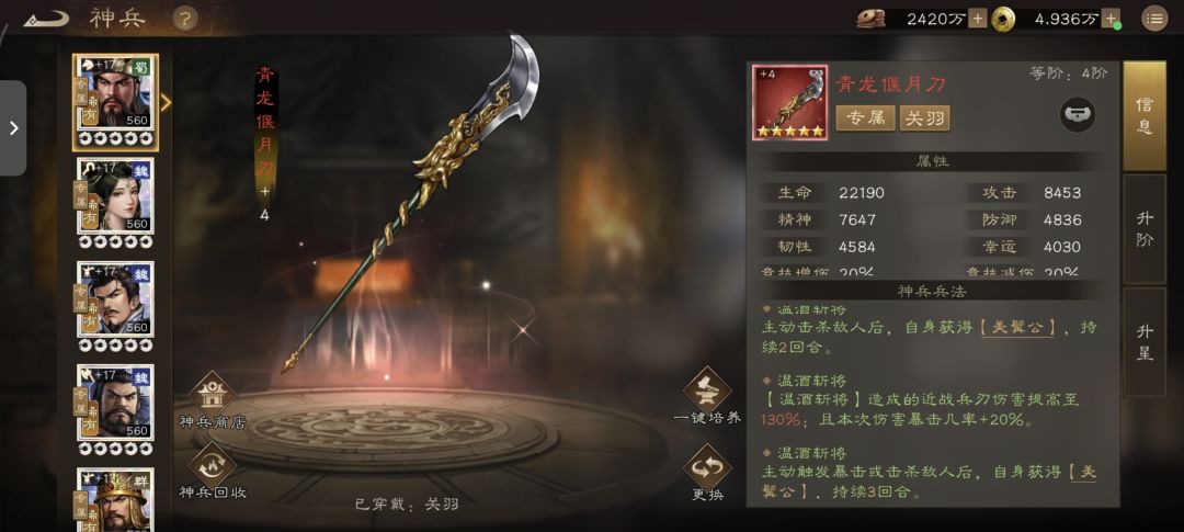 - 5星:主动暴击或击杀后,均可触发“美髯公”且持续延长至3回合,20%攻击加成基本实现常驻(打桩场景完全稳定触发),大幅提升输出上限。