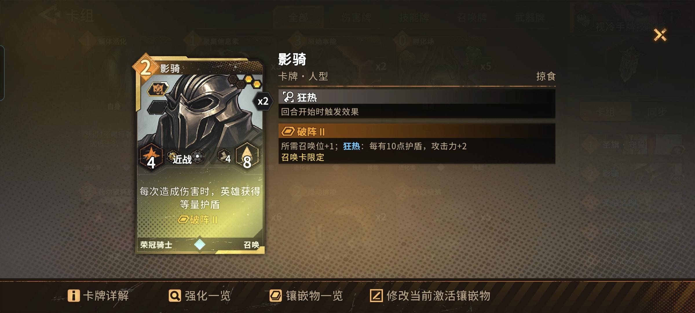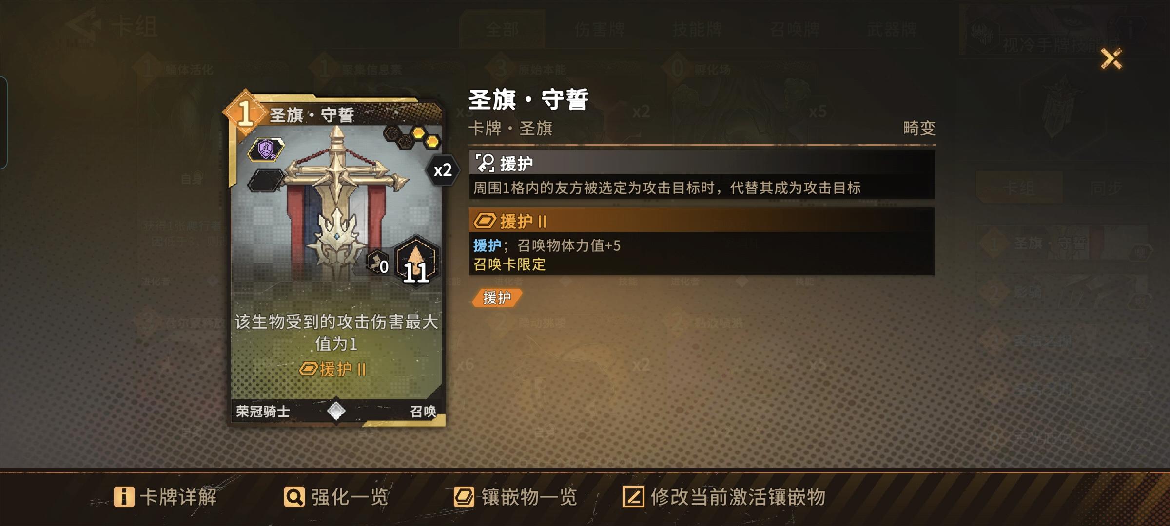 再如果缺少刷新,用屏障代替也未尝不可,但在局内会更需要过牌的能力(多拿几张卡,比如多一张守誓旗和精简命令,没事把旗子插地上再捡起来)和一定的移动力(移动、防线)保证不因为发育不良被提前烤成蘑菇串。