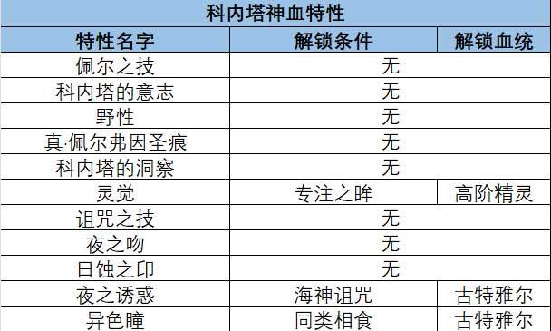 「科内塔」神血特性「佩尔弗因王族」血统角色可觉醒神血部分神血特性需要:「高阶精灵」血统部分红标神血特性需要:「古特雅尔」血统以下为「科内塔」神血特性列表「索弗利夫」神血特性「弗莱德里王族」血统...