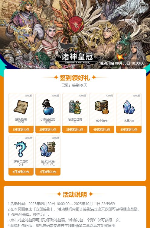 活动开启后,每天进入下方链接点击【立即签到】即可领取一个礼包码,累计签到一定天数后可获得[体验]水晶月卡(7天)~