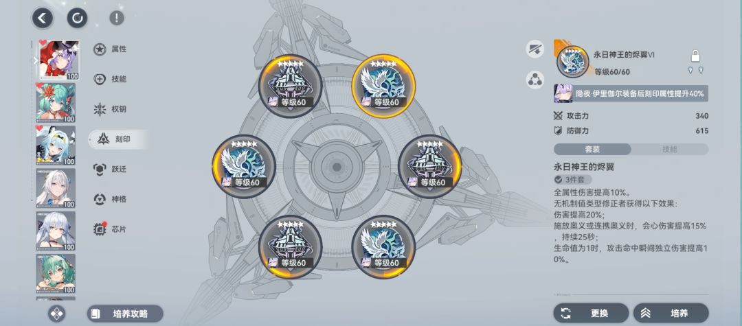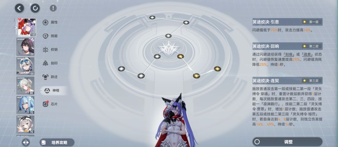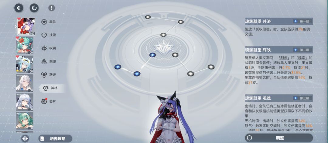 通用伤害类跃迁 因为冰队自带的冰冻体系 所以控抗会最大化的覆盖伤害增益 蓝线神格全队增益与奥义等级挂钩 没有到达SSS-3阶段前 所以56位置选则控抗+奥义等级
