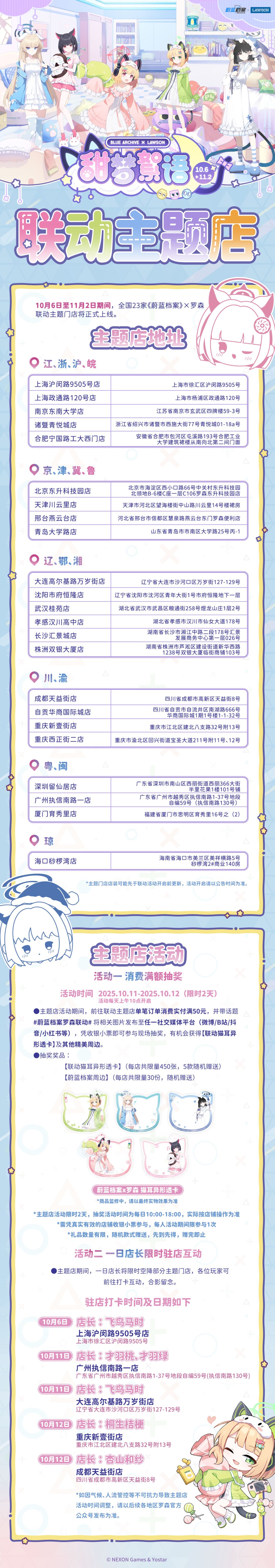 10月06日至11月02日期间,全国23家《蔚蓝档案》× 罗森 主题门店将正式上线,欢迎老师打卡体验哦!