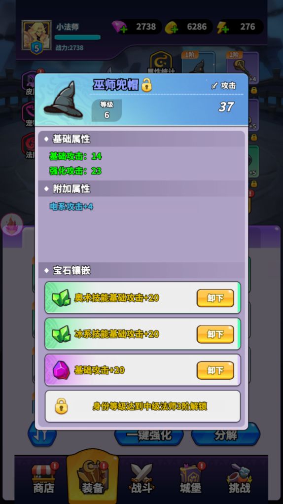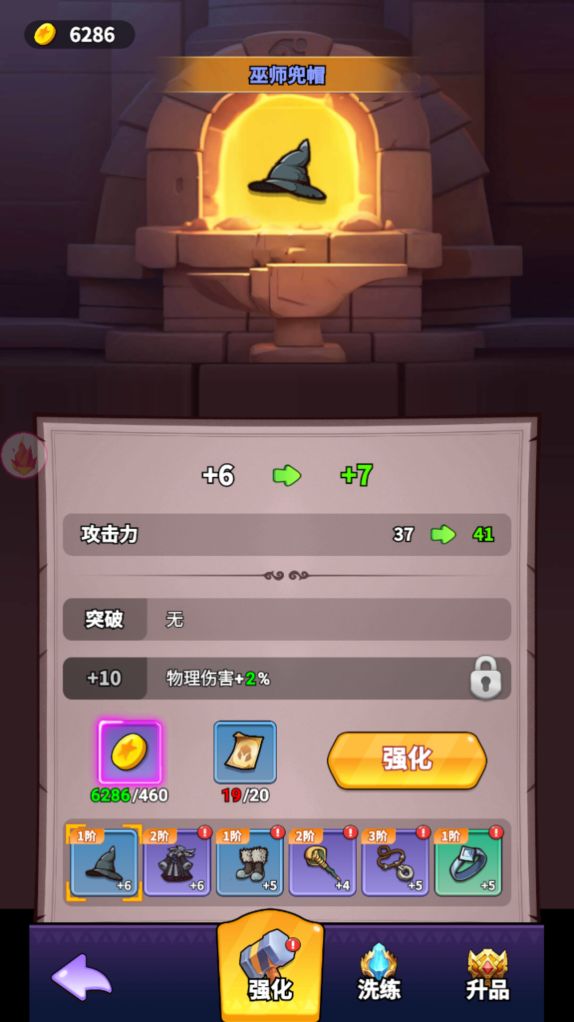 (一)装备篇--多个维度全面提升玩家拥有6个装备槽位,分别是帽子、衣服、鞋子、项链、戒指和武器。这6个部位可以进行强化、升品&洗练和宝石镶嵌四种操作。