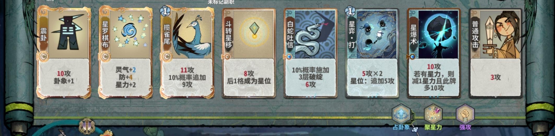 占卦象、聚星力、强攻太香了,可以卡下练气摆星力过渡