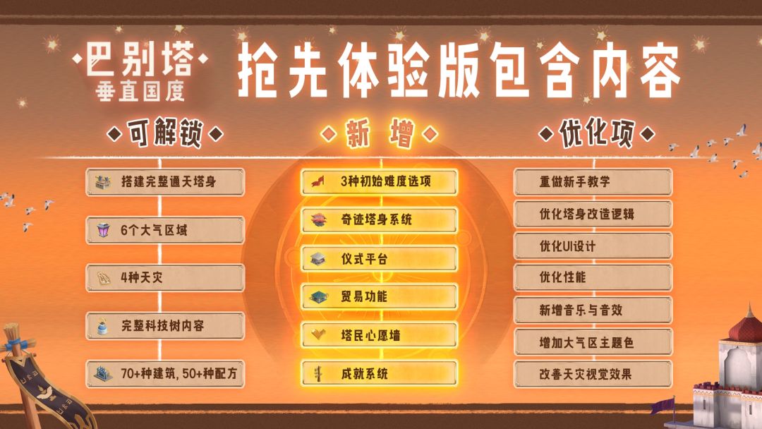 Demo版中有许多内容和功能我们都觉得不够完善,这些在EA抢先体验版中都有大幅的改动。因此,即使你在Demo中已经搭建完了全部12层塔身,也不必担心新存档前期的体验会变得重复又无聊,我们保证EA抢先体验版会给你带来不一样的体验。