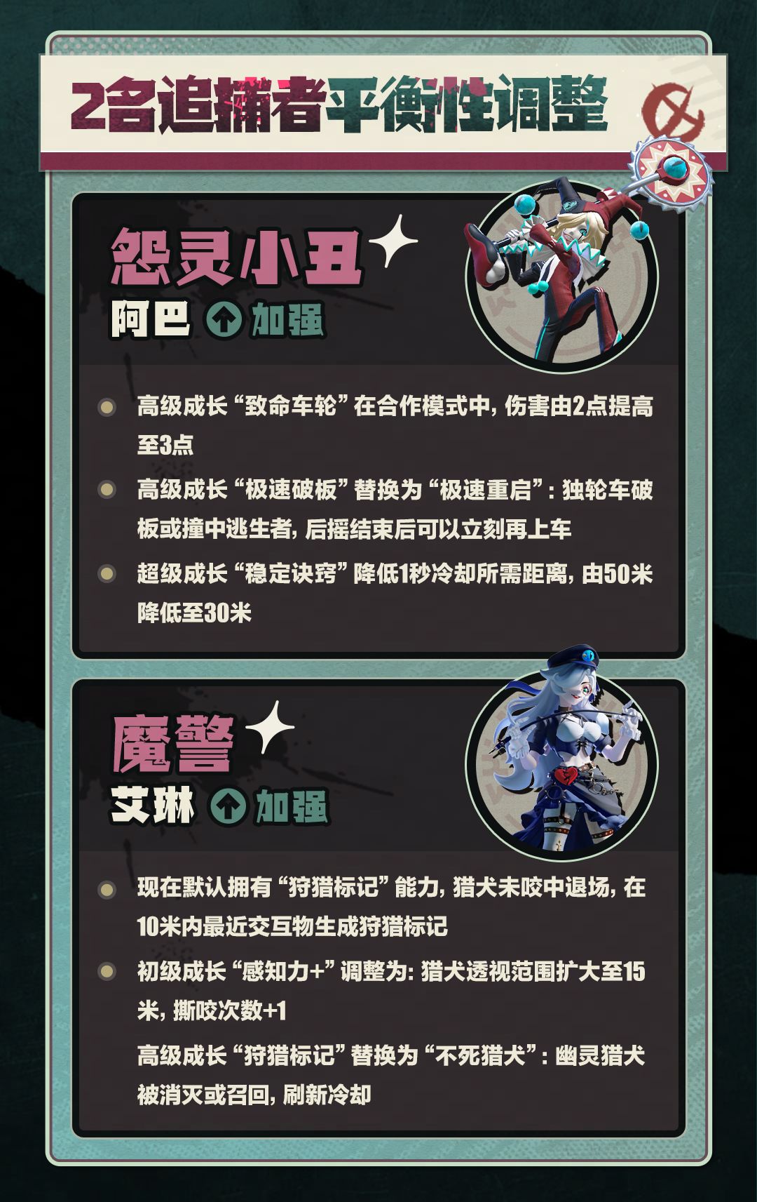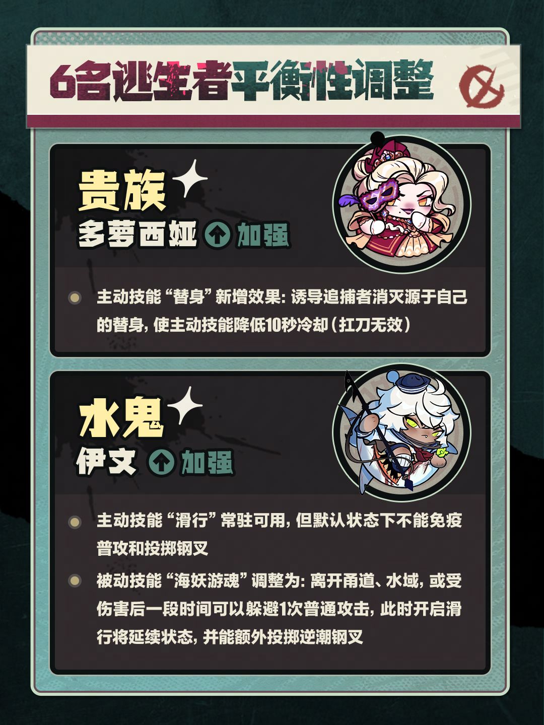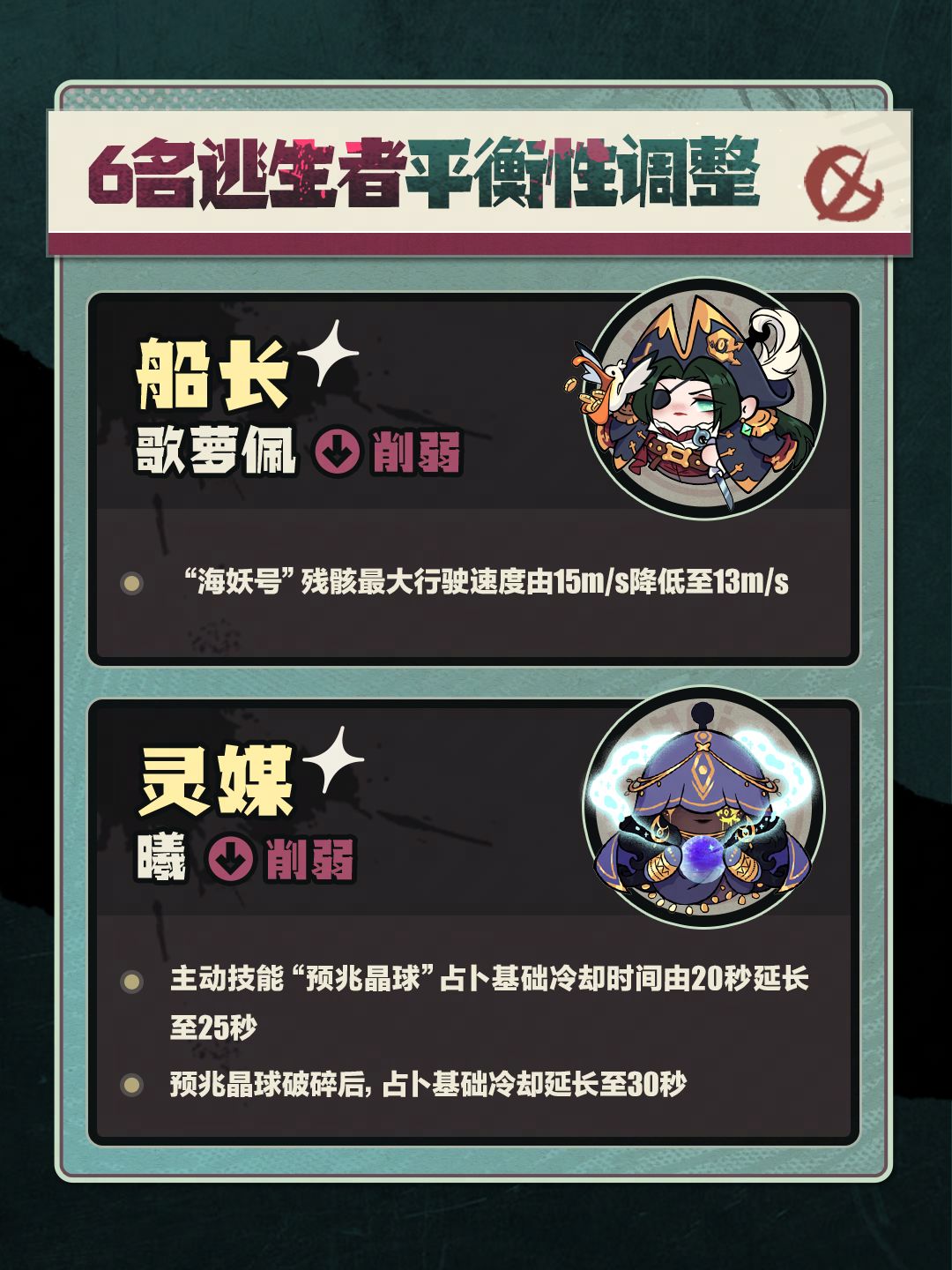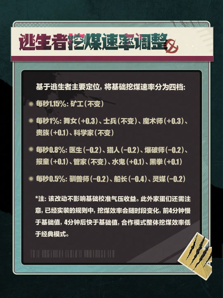 为此,我们这次重点调整了三个方面:调整基础挖煤速率、上调[主牵制]逃生者的博弈收益、上调[强攻型]追捕者的技能容错。具体调整快戳图查看!