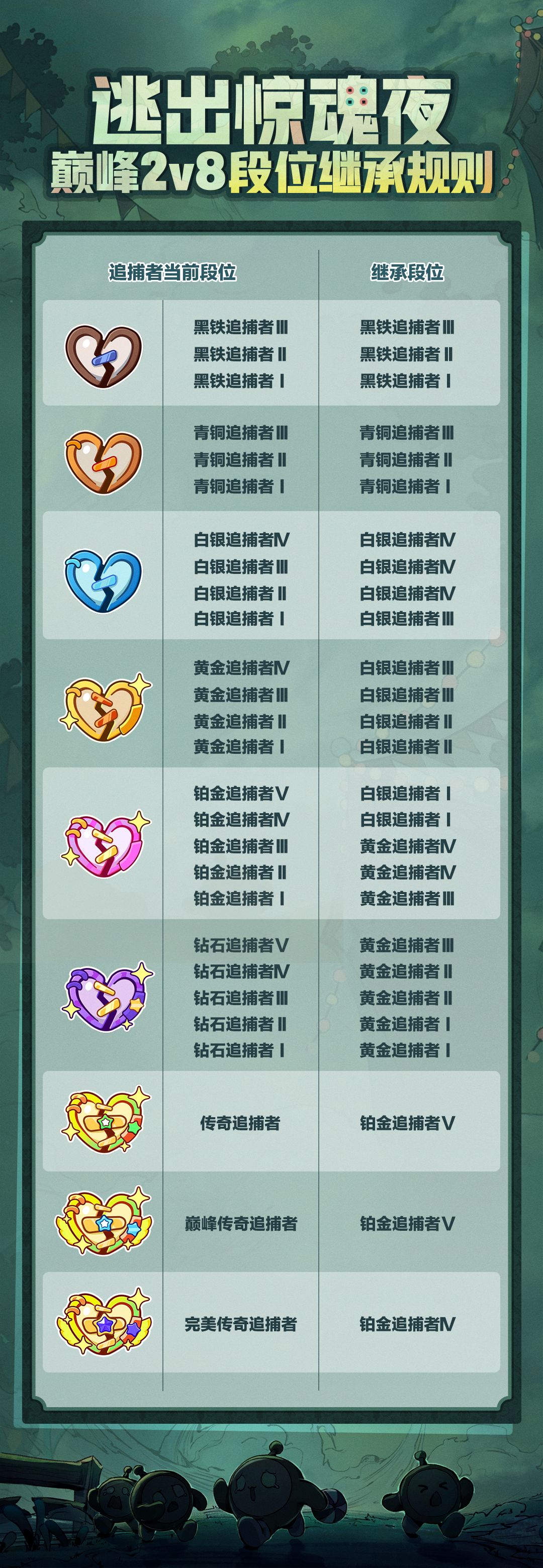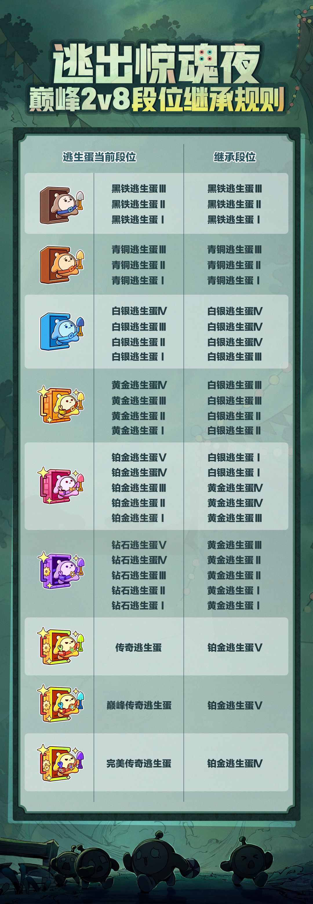 皮蛋温馨提醒:逃出惊魂夜巅峰2v8模式全新赛季将于9月26日(明天)18:00开启,蛋仔们的段位也将迎来重置,段位继承规则详见图片哦~