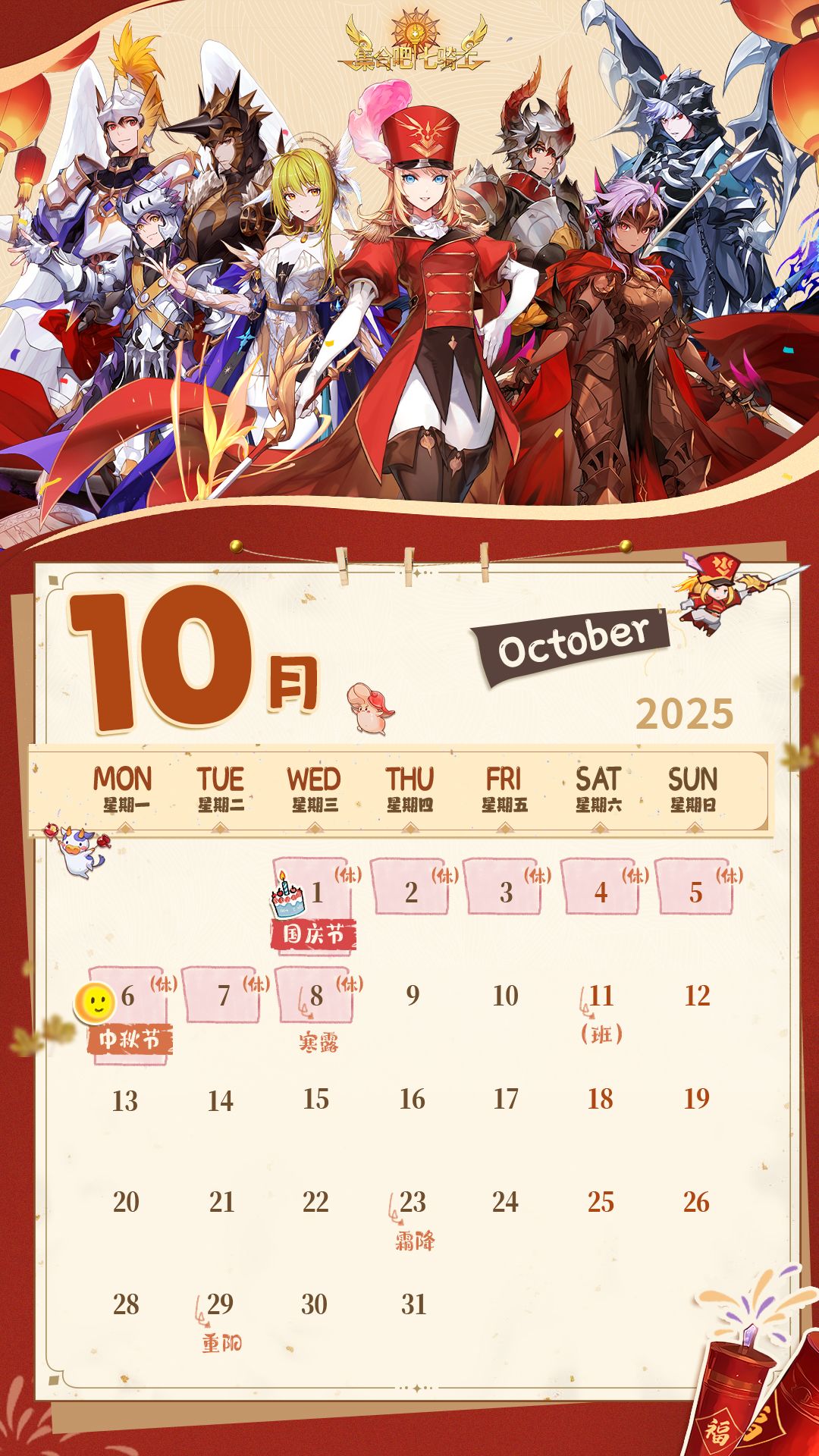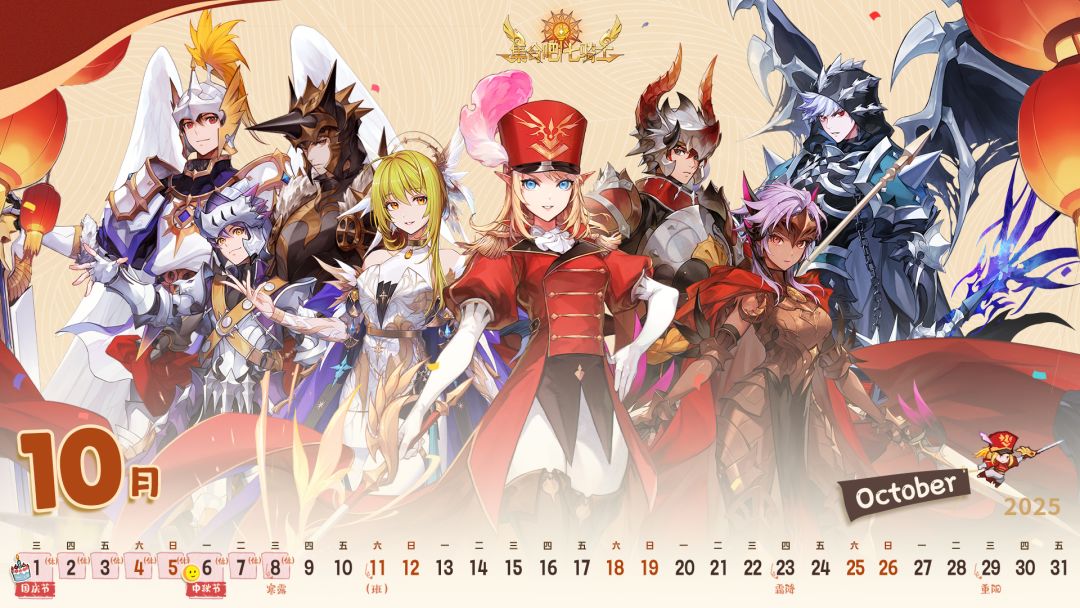 十月的风已染上收获的色彩,七骑士披荣耀战甲,立于璀璨秋光之中,静候与各位团长并肩开启新的传奇。恰逢盛世华诞,愿这份专属月历伴您度过一个充满荣耀与休憩的美好假期。