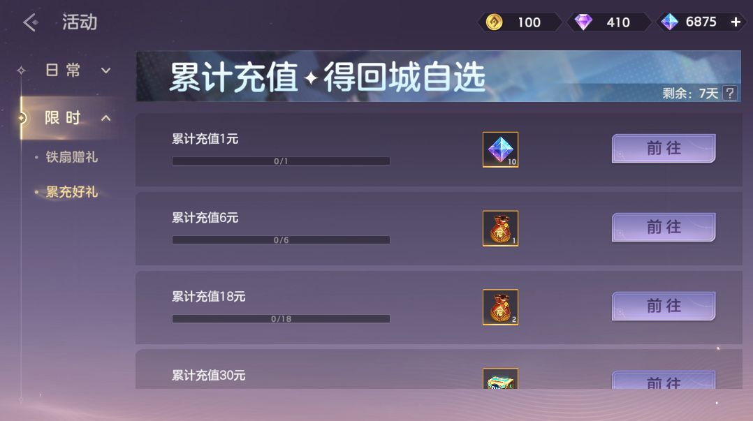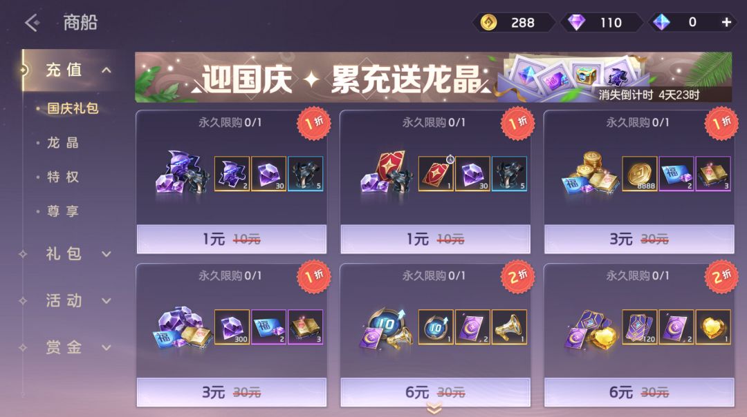 完成累充任务即可获得回城特效自选箱、国庆自选包(皮肤碎片*5、龙魂祈福卡*1)、龙晶。