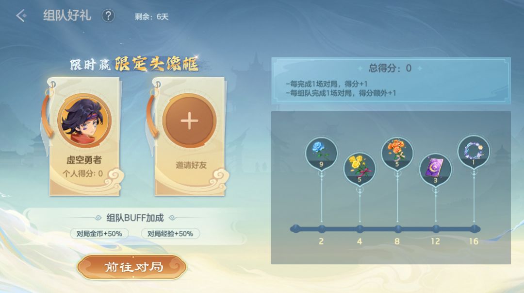 完成对局获取得分,与小队成员共同对局更有额外得分奖励。根据总得分可领取新品限定头像框月庭花影、寻宝签、淡雅之馨、温情之馨、热诚之馨奖励。