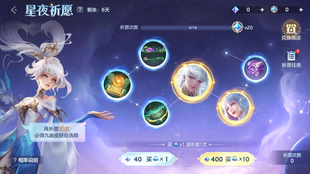 许愿期内每日登录可许1次愿望,最多许5个愿望。愿望奖励有皮肤8折龙晶折扣券、英雄6折金币折扣券、礼券、龙魂祈福卡、皮肤碎片、寻宝签、7天高级星盘特权卡等。