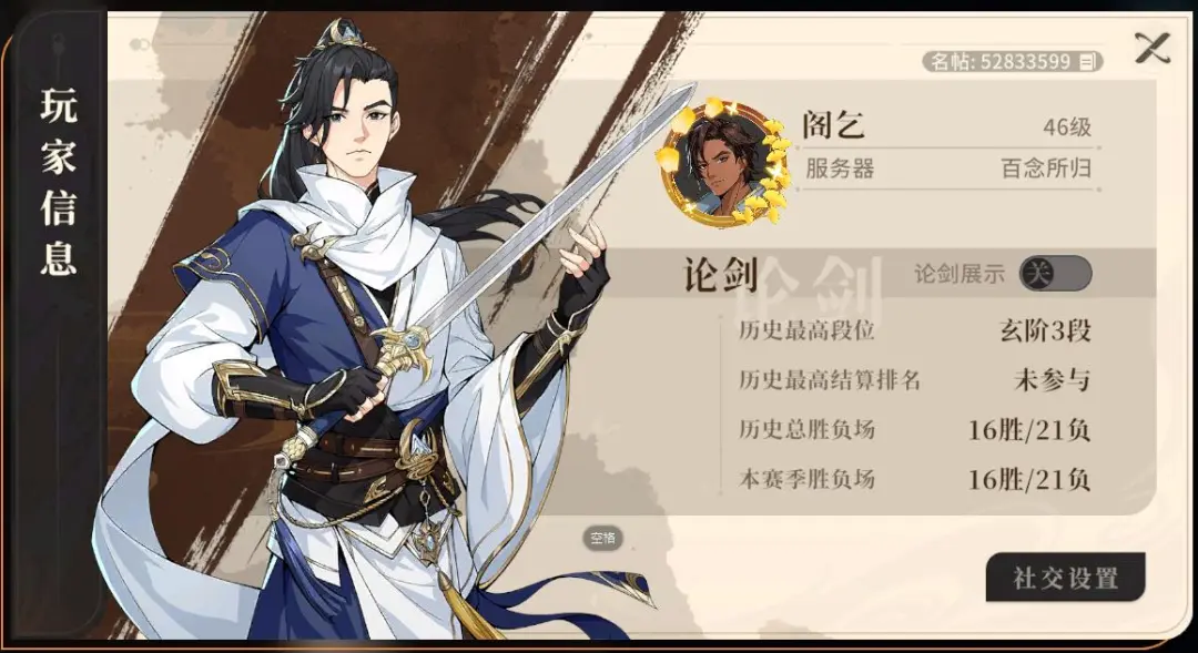 在【聊天】与【好友】界面中,点击头像可查看个人的玩家信息,将展示剑川之主的昵称、头像、头像框等信息,各位可自行选择是否展示论剑数据,强化论剑,收集奖励,向更多人展示你的江湖成就吧!