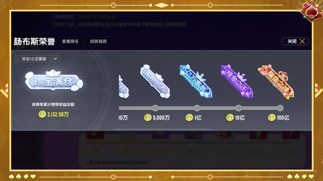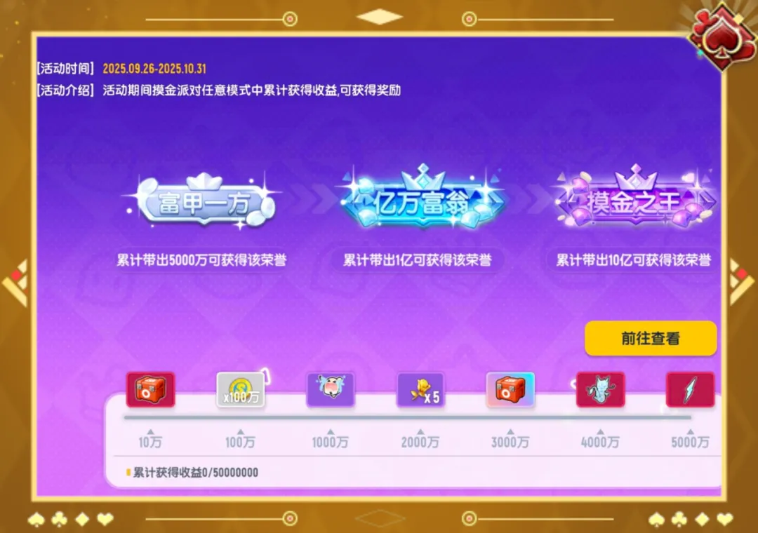 累计带出的收益达指定数额还可获得【富甲一方】、【亿万富翁】、【摸金之王】、【摸金之神】等荣誉称号。带出收益越高,奖励越豪华!