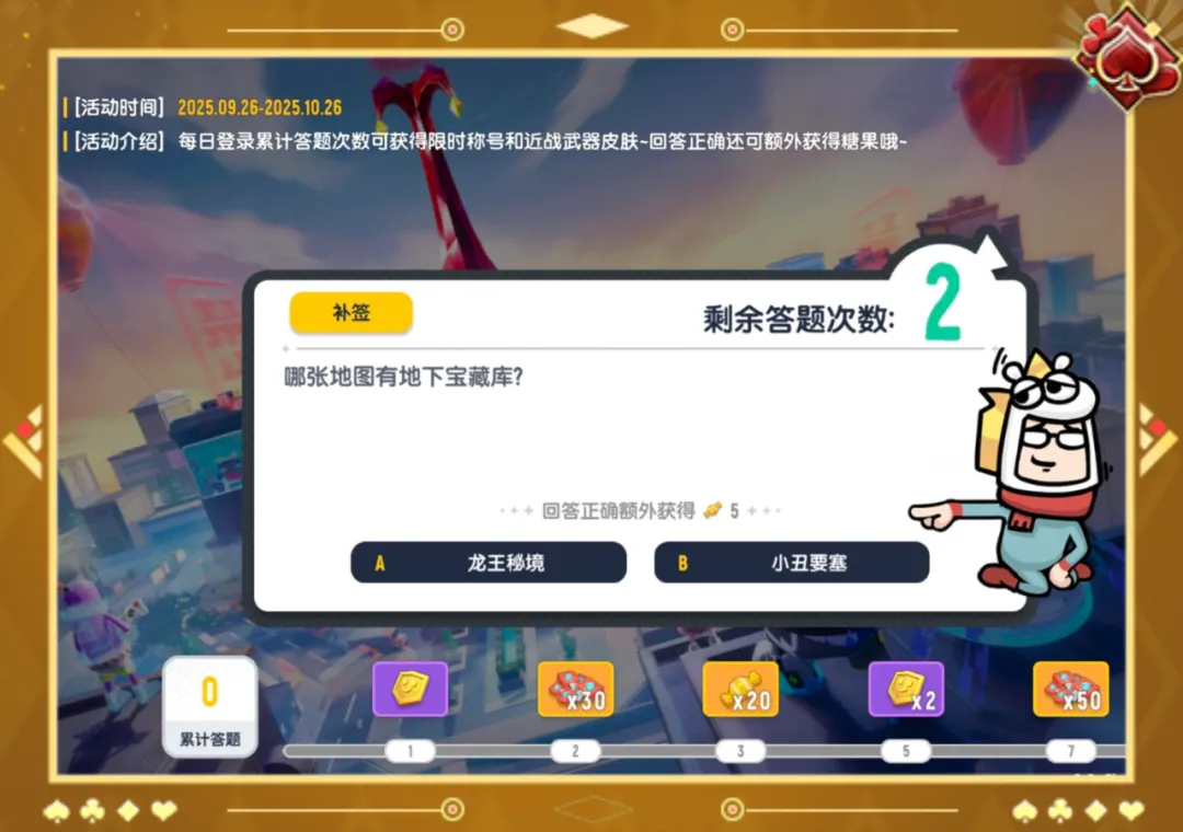 每日登录参与答题,答对题目即可获得糖果。累计答对指定次数,更能解锁缤纷补给箱钥匙、免哭金牌、占卜币,还有糖果、【版本征服者】限时称号、【平底锅-云台相机】近战武器皮肤等豪华奖励!此外本次活动获得的限时称号有一定的时间限制,肠肠们要注意使用期限哦~