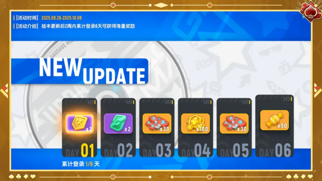 版本更新后两周内,肠肠累计登录满6天,即可领取免哭金牌、友友卡、缤纷补给箱钥匙、季票勋章、糖果等海量好礼!上线就能领福利,助力畅玩新赛季!