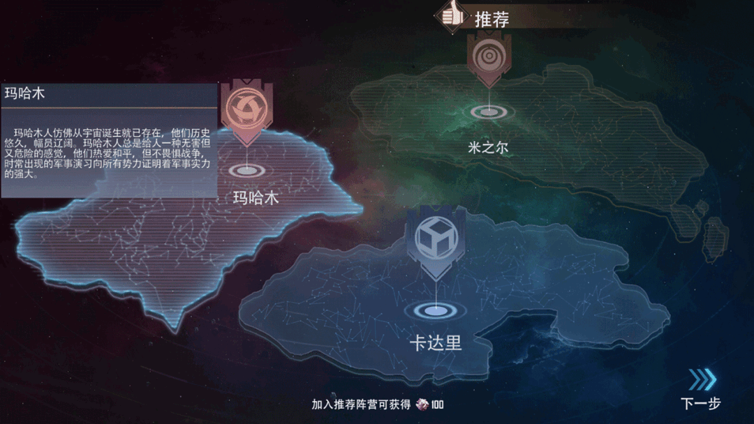 玛哈木阵营:玛哈木人仿佛从宇宙诞生就已存在,他们历史悠久,幅员辽阔。玛哈木人总是给人一种无害但又危险的感觉,他们热爱和平,但不畏惧战争,时常出现的军事演习向所有势力证明着军事实力的强大。