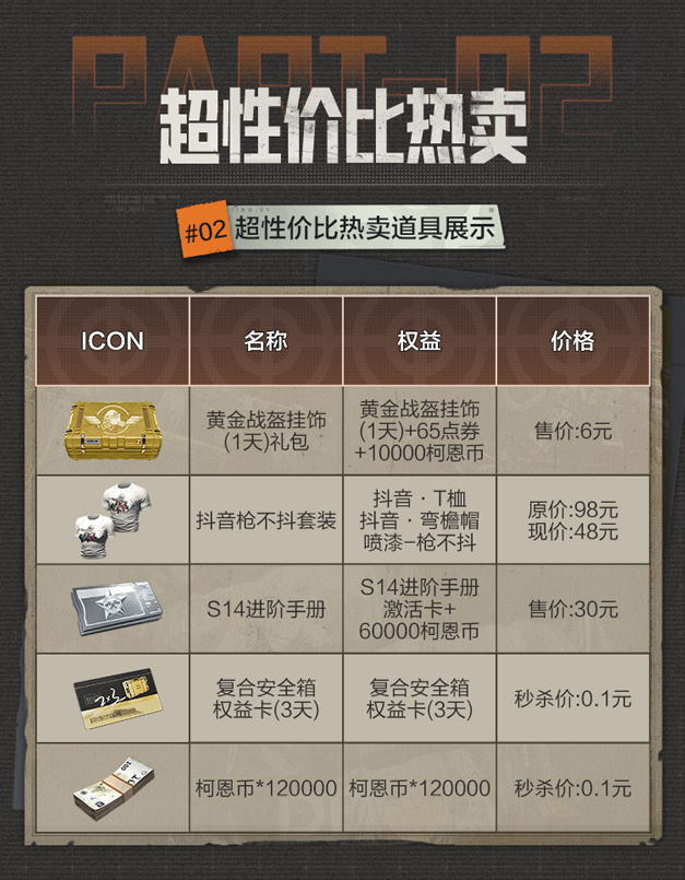 超性价比热卖专场!黄金战盔挂饰礼包、抖音枪不抖套装、S14进阶手册、2x3安全箱(3天)等多款热门道具,最低仅需0.1元!