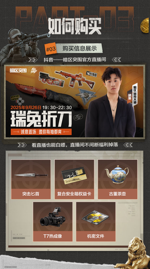 瑞兔折刀独家返场!9月26日19:30,锁定暗区突围抖音官方直播间,多款热门军需&道具惊喜热卖!(如26当日售完,则返场活动立即截止)