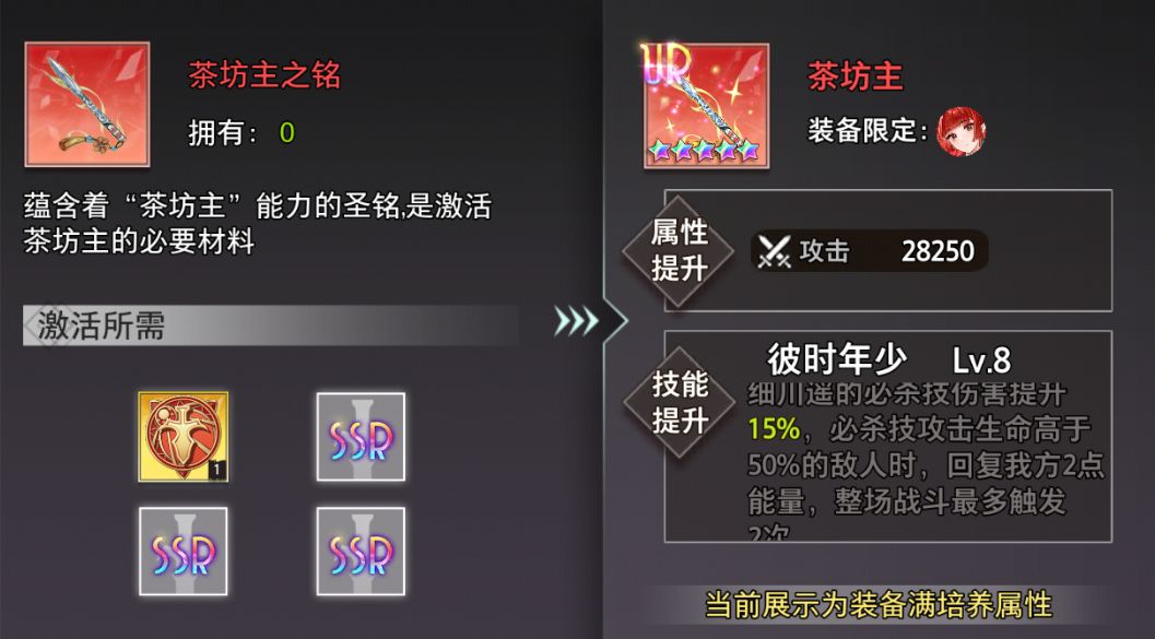 细川遥的必杀技伤害提升15%,必杀技攻击生命高于50%的敌人时,回复我方2点能量,整场战斗最多触发2次