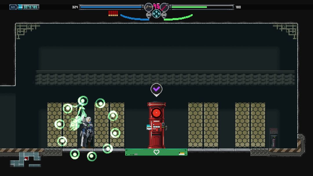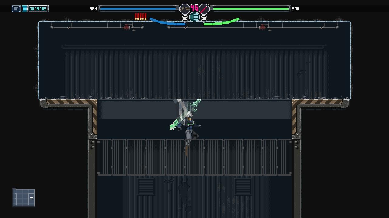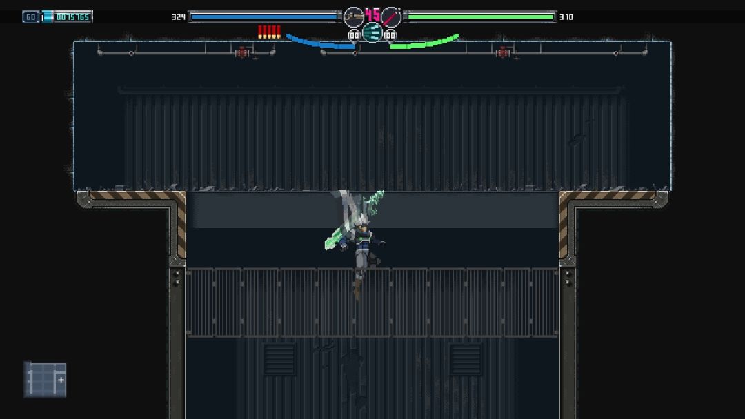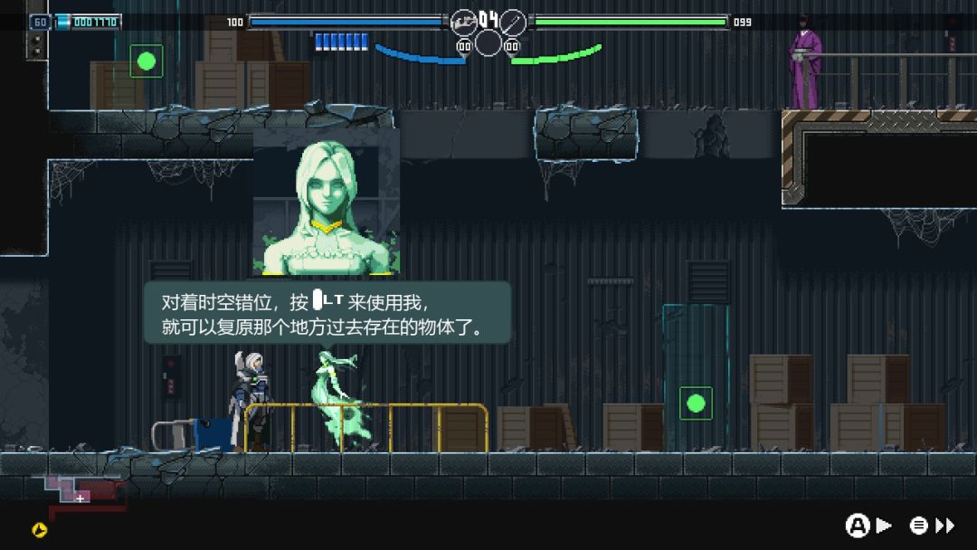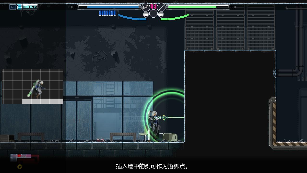 解密也是银河城不可或缺的一环。妖萤刀“勒克丝”可以使特定物体时光倒流,从而创造前进道路。但在有些时候,玩家也可以把她插上墙壁作为踏板向上攀升。那是不是所有高处都可以利用这一方法到达吗?显然并不完全是。制作组对于这爬墙的限制则是通过覆盖一层金属墙壁实现,玩家想要到达高处更多只能通过传送实现,而一些特定关卡则是为玩家提供喷气背包。