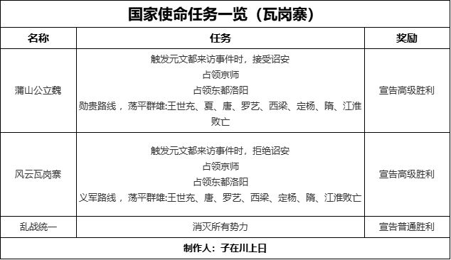 瓦岗寨的具体国家使命任务可见下表: