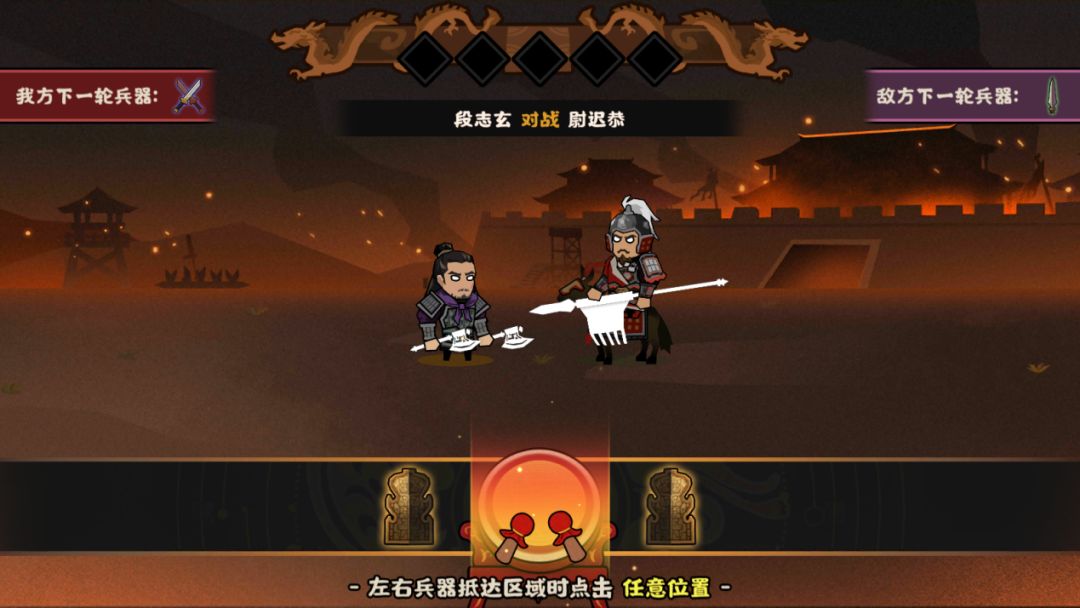 单挑的玩法类似音游玩法,当左右两侧的兵器到达中间的判定区时,点击屏幕任意位置就可以进行一次单挑。(当然,也有点类似之前龙舟活动的小游戏~)