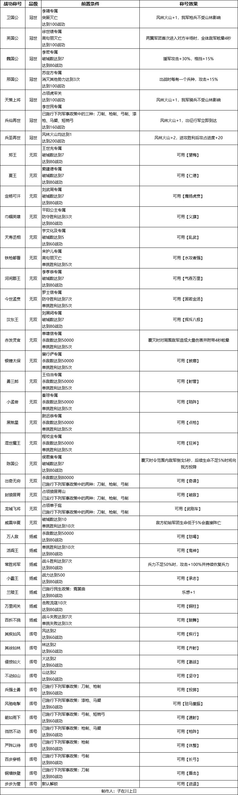 具体战功称号效果可见下表: