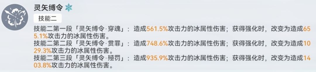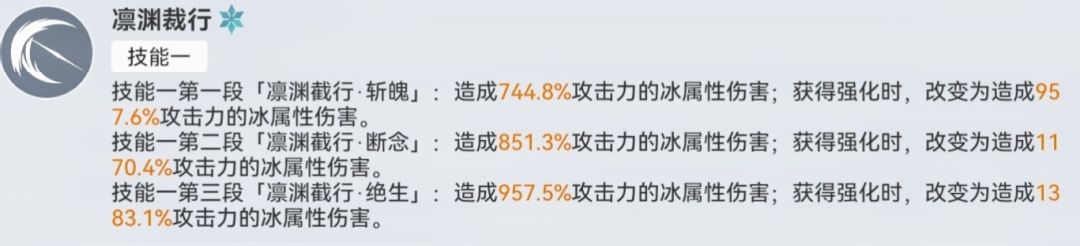 · 普通攻击:剑弩共和5段,造成冰伤。特定段数(第一、二、四、五段)在强化时伤害值会改变。