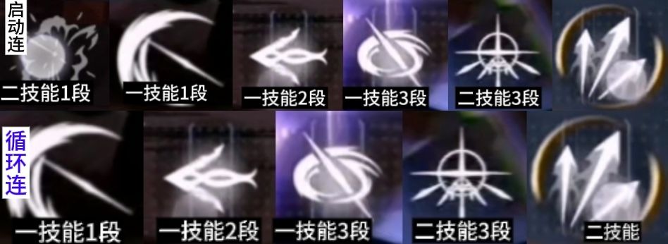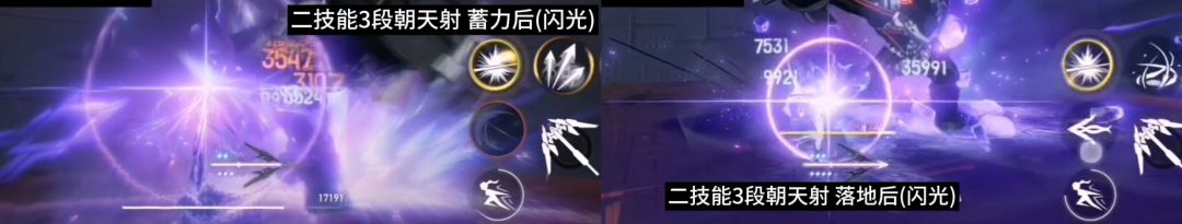 与1技能相比比较墨迹,尤其第三段朝天射,若是没连上没有黄条无敌,直接被打断.也是和1技能1样有衔接效果(闪光衔接普攻/技能/闪避)。