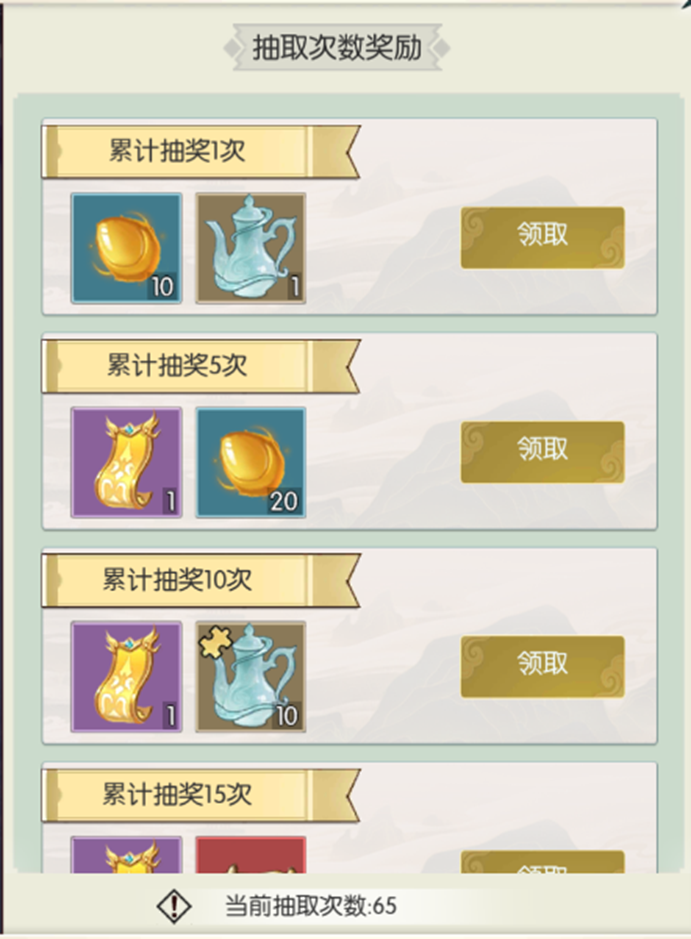 活动累计抽奖达到一定次数可以领取次数奖励,活动抽奖1次即可获得活动限定橙色秘宝碎片:霁月清风壶!活动抽奖15次还可以获得活动限定红色秘宝:万里江山卷!次数奖励中还可以获得洪荒符、秘宝升星/凝练材料!