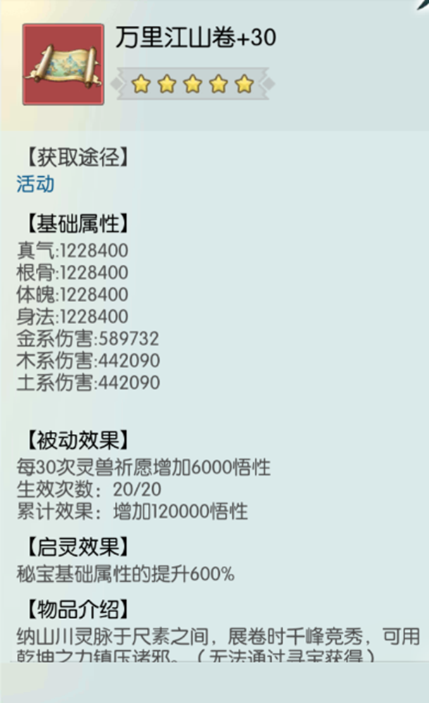 天级大奖中活动限定新红色秘宝碎片:万里江山卷、限定仙灵自选礼包、花仙儿信笺、墨云信笺、弟子自选箱、神器自选礼包等大奖等你来拿!万里江山卷升至满星需要的碎片均可以在本次活动中获得!更有喜欢的道友千万不要错过~