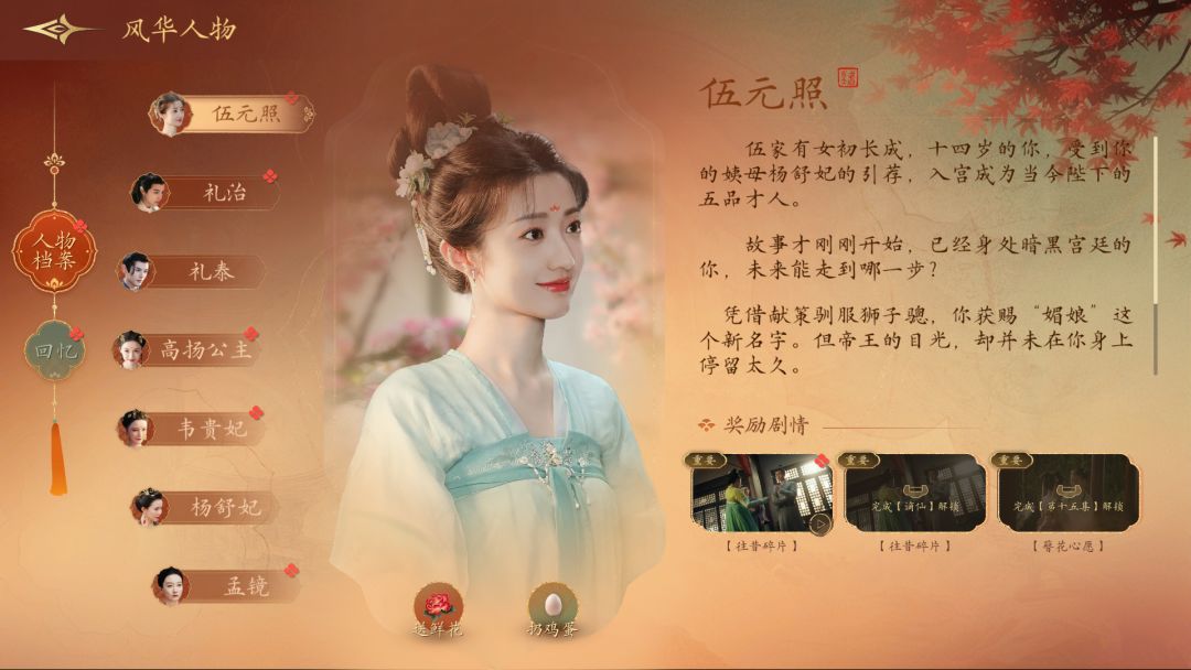 【吃人的后宫】、【夜宴惊魂】、【东宫迷情】、【冷宫鬼魅】、【南山猎焰】、【危险的谶言】、【贵妃的盛宴】、【君权下的爱】、【生死时局】、【命运的新篇章】各奖励29朵鲜花&1000铜币;