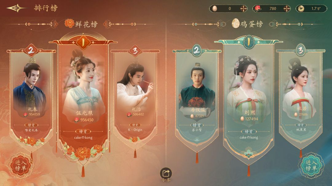 不知道各位主子有没有发现游戏里的【排行榜】功能,这个排行榜可不同于一般游戏那种,给玩家通关进度、通关速度等记录打榜,而是利用游戏中的鲜花/鸡蛋道具,去给对你印象最深刻的角色投票。