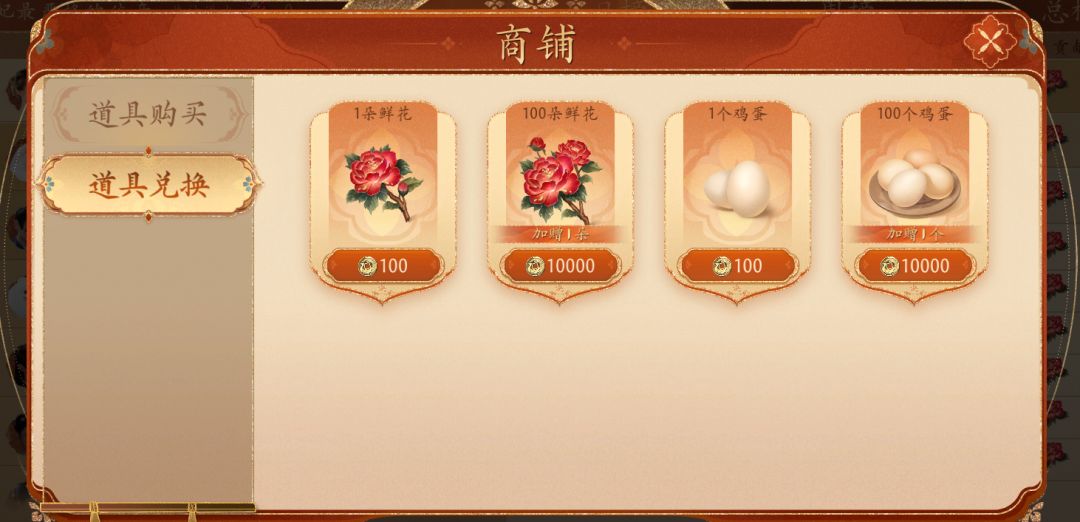 在获取了铜币之后就可以按比例换取鲜花和鸡蛋了,一次性兑换100个还会额外附送一个。