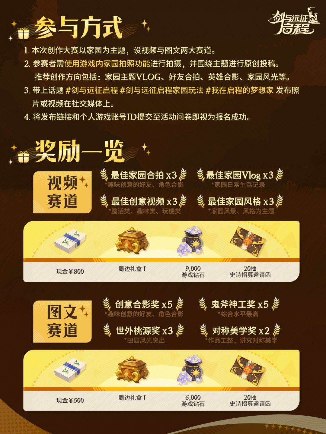 使用游戏内家园拍照功能,制作剑与远征启程家园内的摄影、摄像作品,带指定话题发布笔记,并填写问卷完成投稿登记。活动结束后,将分图文、视频分别进行获奖评选,赢取奖金、周边等礼物。