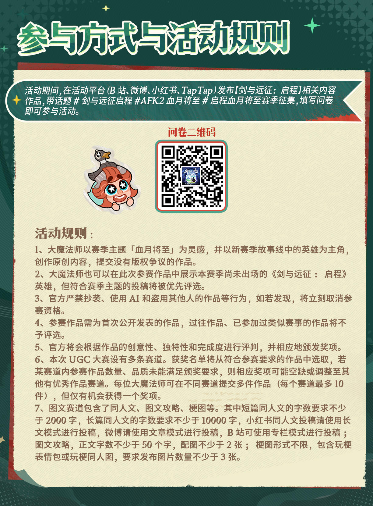 「血月将至」赛季现已上线!一同重返诸神的时代,也欢迎大魔法师参与新版本的征集活动~发布您创作的同人作品并带上指定话题: #剑与远征启程 、#afk2血月将至 、#启程血月将至赛季征集 ,填写问卷即可参与活动!