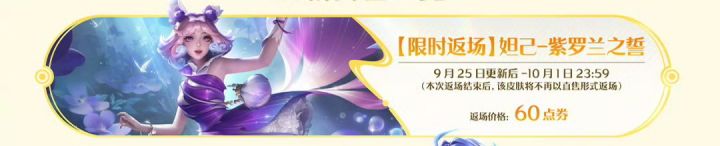 《王者荣耀》官方确认,妲己勇者限定皮肤「紫罗兰之誓」将于9月25日至10月1日开启最后一次直售返场,售价60点券。此次返场结束后,皮肤将彻底告别直售渠道,未来若返场仅能通过抽奖获取,成本或飙升至百元级别甚至更高。