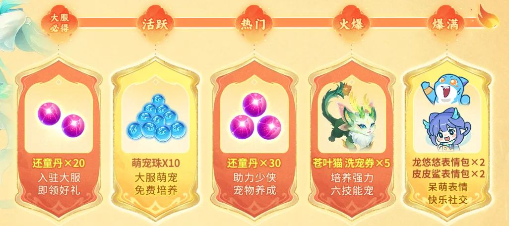 1)入驻金秋大服,达到30级后即可获取还童丹、萌宠珠、皮皮鲨与龙悠悠表情包等好礼!