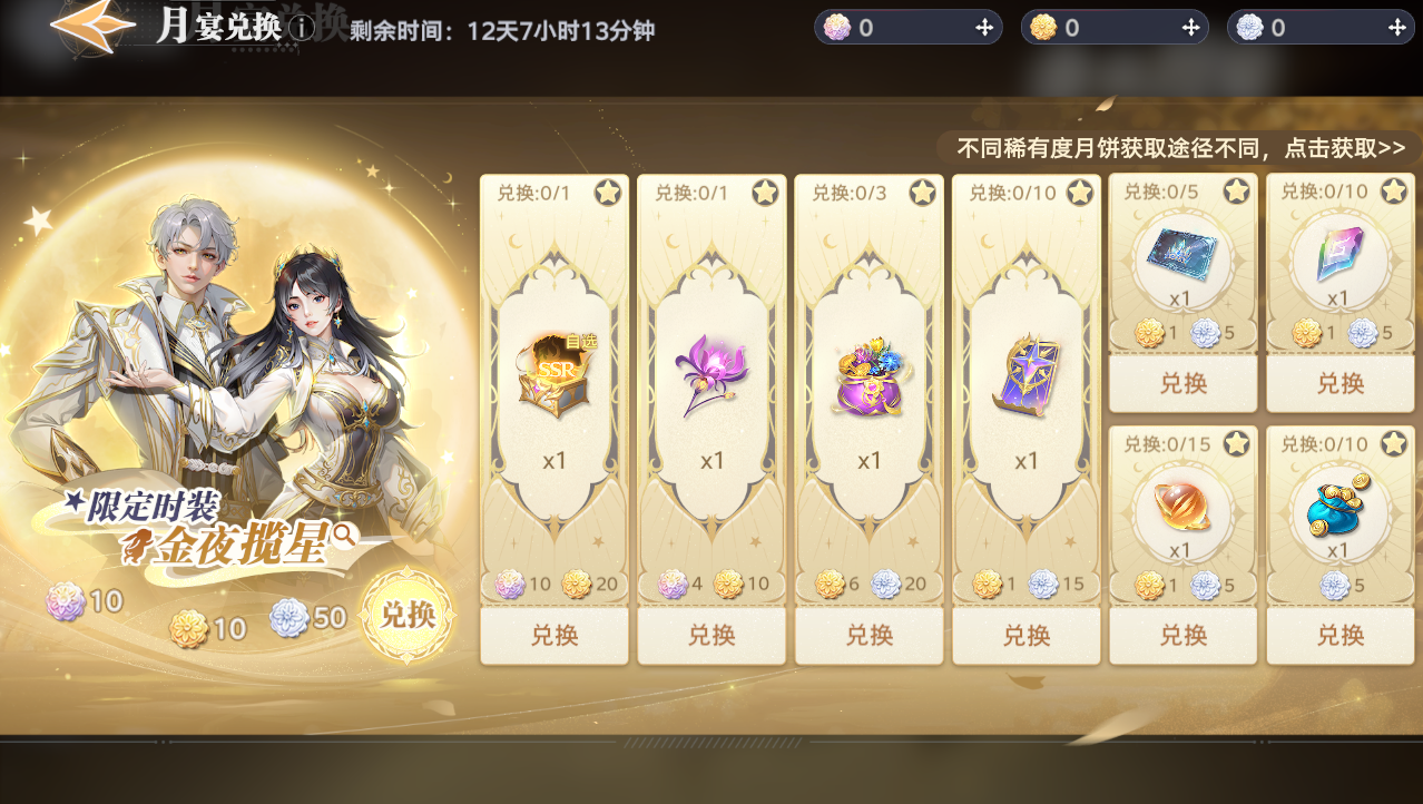 ➢ 活动规则:活动期间,通过日常玩法和节日活动,可获取不同月饼道具,使用月饼道具可兑换珍稀奖励,更有限定时装“金夜揽星”,自选SSR武魂可免费兑换获得。