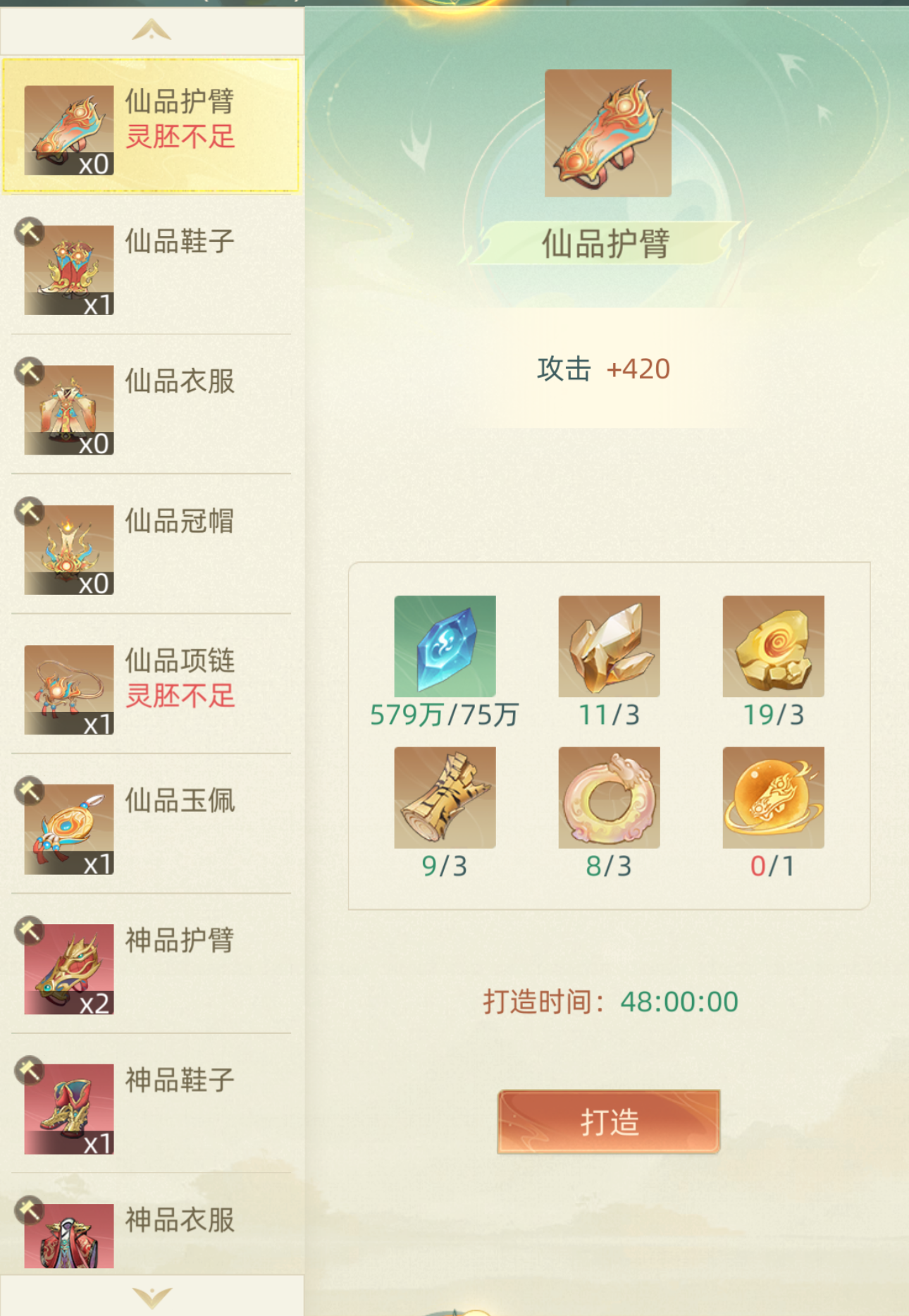 神品装备合成所需:炽阳铁*9、混元石*9、龙血木*9、通神玉*9、神品转装备灵胚*1