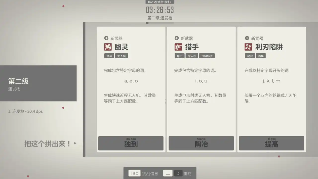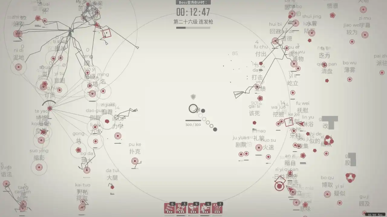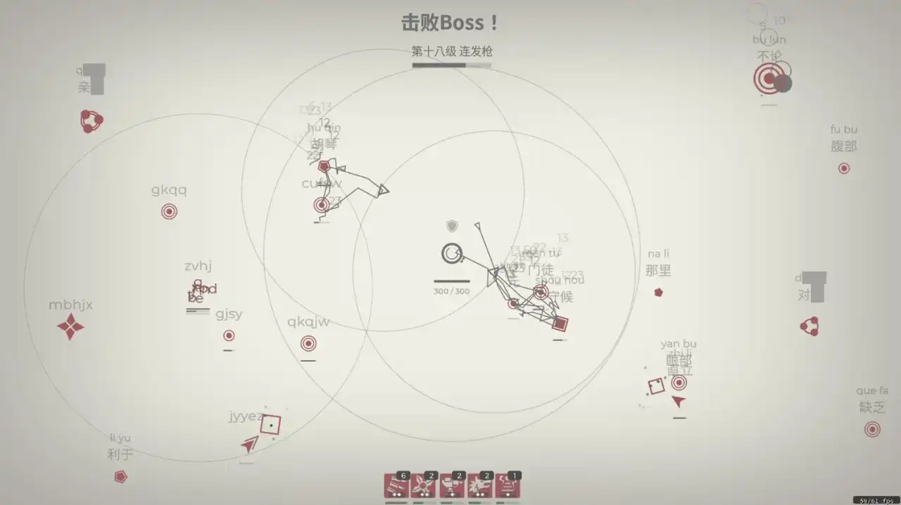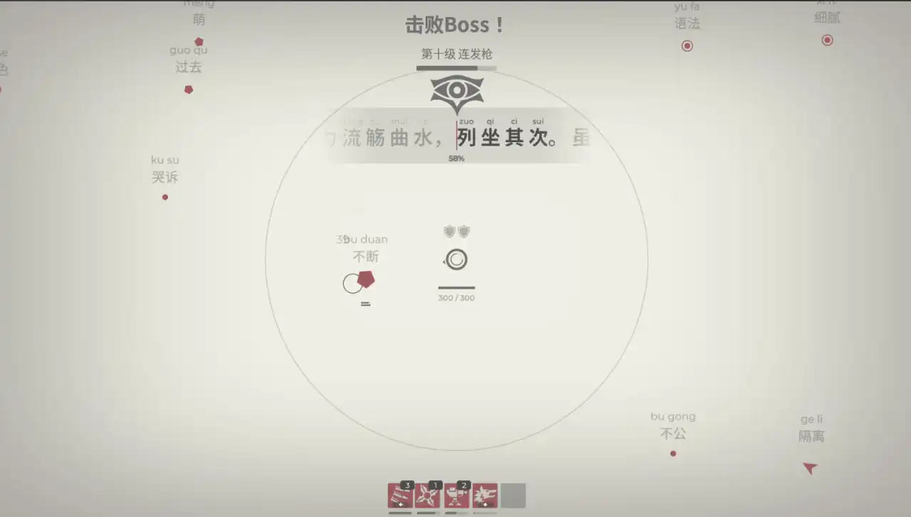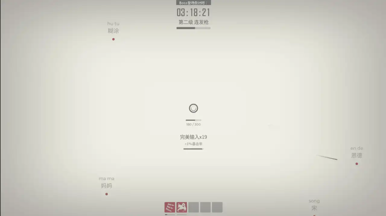 不过游戏目前作为测试版也存在一些问题,比如到后期满屏的敌人字符挤在一起,根本看不到要打什么字,有些武器的效果也会把敌人的字符挡住,比较影响游戏体验。而且上方的拼音和下方的字符有时候会出现没有对齐的情况,我打诗人这个boss的时候就遇到过,当我键入好几次发现进度没有长的时候才反应过来