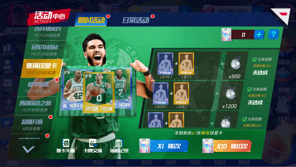 全新的限量球星卡登场!各位经理人可完成本期任务或购买限量卡包抽取球星卡。也可和其他玩家交换收集到的球星卡。最终,根据激活球星卡图鉴个数获得对应奖励,同时可在活动内使用收集到的球星卡兑换相应的奖励。