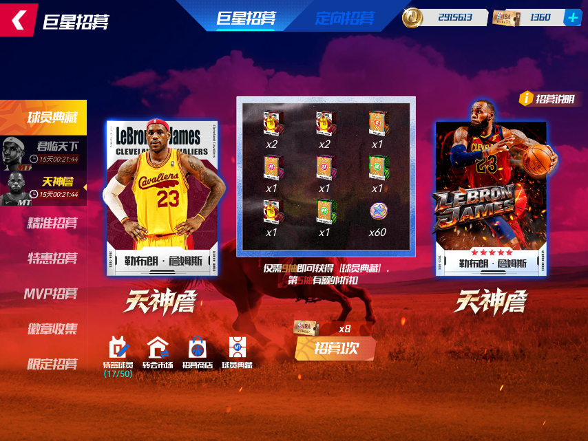 全新球员典藏卡池重磅来袭!活动期间,可使用【典藏招募函】在【典藏招募-天神詹】池中,获取全新骑士詹姆斯球员典藏。